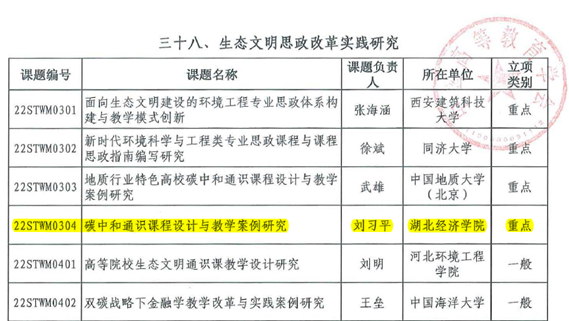 近日,中国高等教育学会公布“2022年度高等教育科学研究规划课题”立项名单,太阳集团见好就收9728刘习平副教授主持的1项生态文明思政改革实践研究课题《碳中和通识课程设计与教学案例研究》获批为重点项目。中国高等教育学会“2022年度高等教育科学研究规划课题”面向全国高校申报,其中生态文明思政改革实践研究课题重点项目共4项。