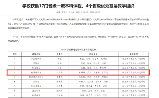 近日,省教育厅下发《关于公布2022年度省级一流本科课程认定结果的通知》 ,太阳集团见好就收9728刘习平副教授的《能源经济学》课程获批为省级一流本科课程。