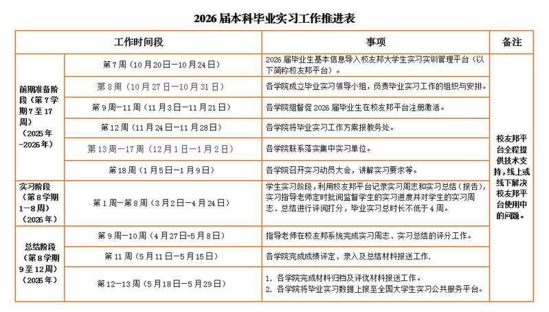 1.第7学期第7-12周:毕业生基本信息导入校友邦平台,组织师生进行平台操作培训并试用。进行实习动员,讲解实习要求;