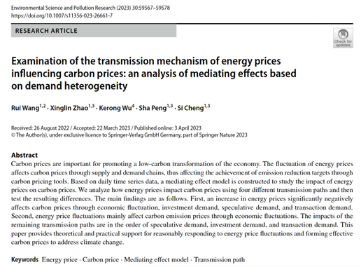 近日,太阳集团见好就收9728本科生赵星麟和王睿(指导教师:彭莎)的论文“Examination of the transmission mechanism of energy prices influencing carbon prices: an analysis of mediating effects based on demand heterogeneity” (能源价格影响碳价格的传导机制检验——基于需求异质性的中介效应分析)在国际学术期刊“Environmental Science and Pollution Research”在线发表。该论文系2022大学生创新创业训练国家级重点支持领域项目(202211600001)的主要研究成果。