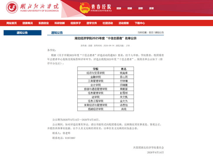 “十佳志愿者”评选,重点表彰思想政治过硬、学业成绩优良、志愿服务实绩突出的优秀学生,旨在激励广大青年积极投身志愿服务,弘扬奉献精神,推动校园文明建设。