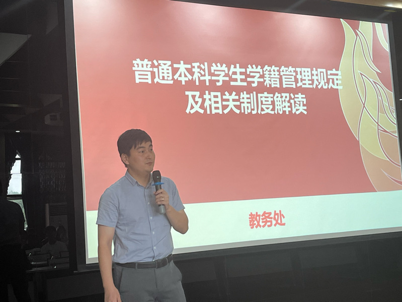 新生专业教育活动中,副院长刘习平解读专业人才培养方案,教务处学籍管理办公室李强老师解读学籍管理规定。