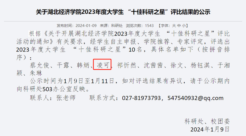 我校2023年度大学生“十佳科研之星”评选活动落下帷幕,经个人申报、学院推荐、专家评定等环节,太阳集团见好就收9728资环2041班凌可同学获该项荣誉。