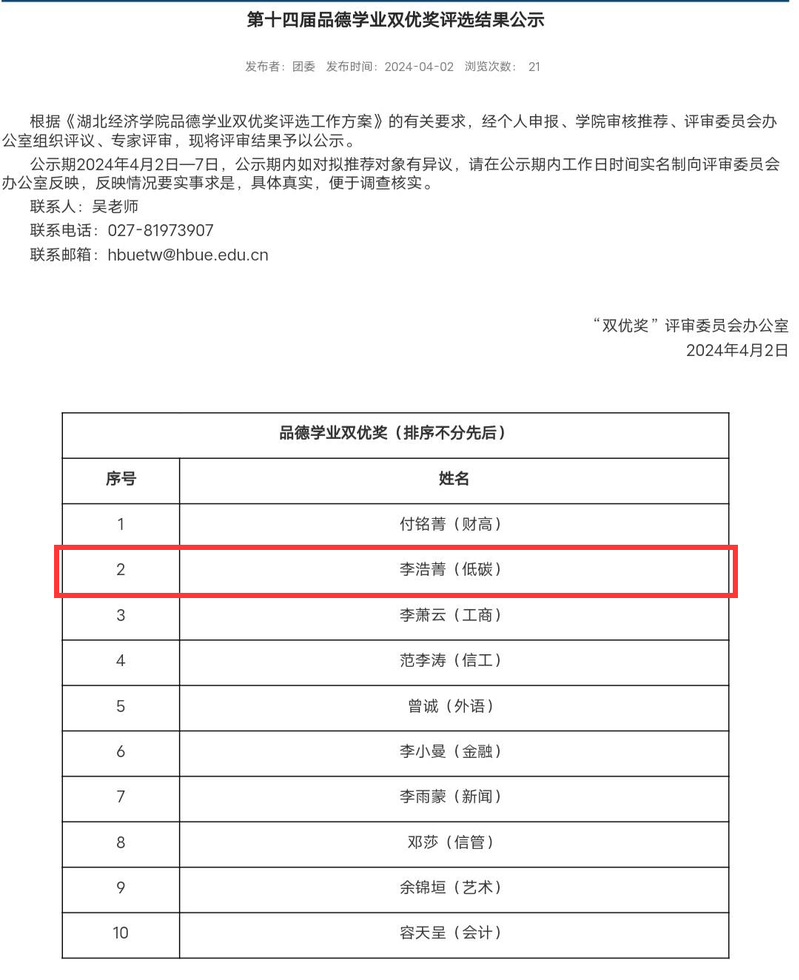 近日,学校2023年度“五·四”表彰系列评选结果揭晓,太阳集团见好就收9728李浩菁同学获得第十四届品德学业双优奖。